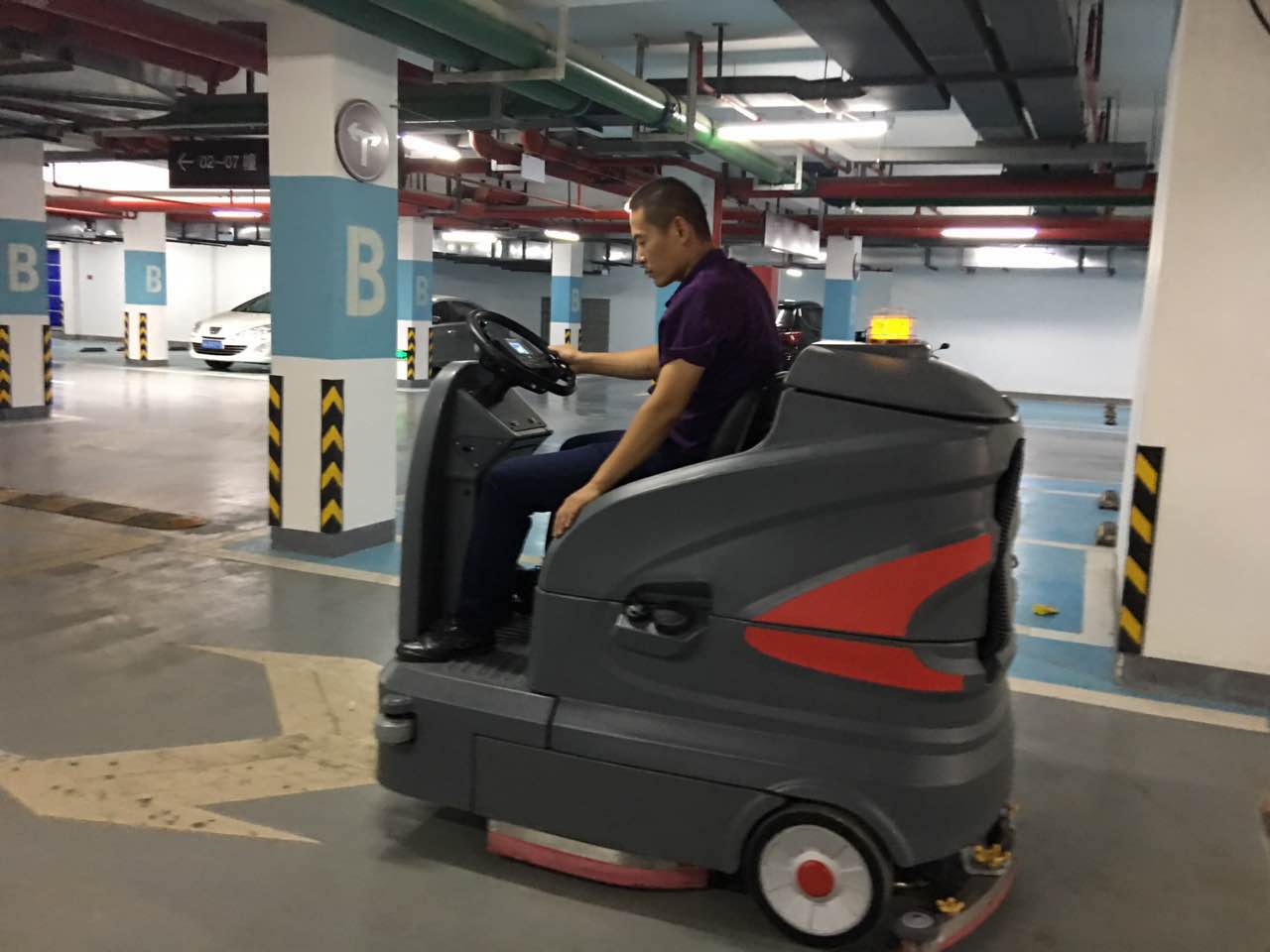 駕駛式洗地機可以將地下車庫的灰塵徹底清洗干凈,而且不會殘留水漬,避免二次污染,可以大大地減少浮塵。